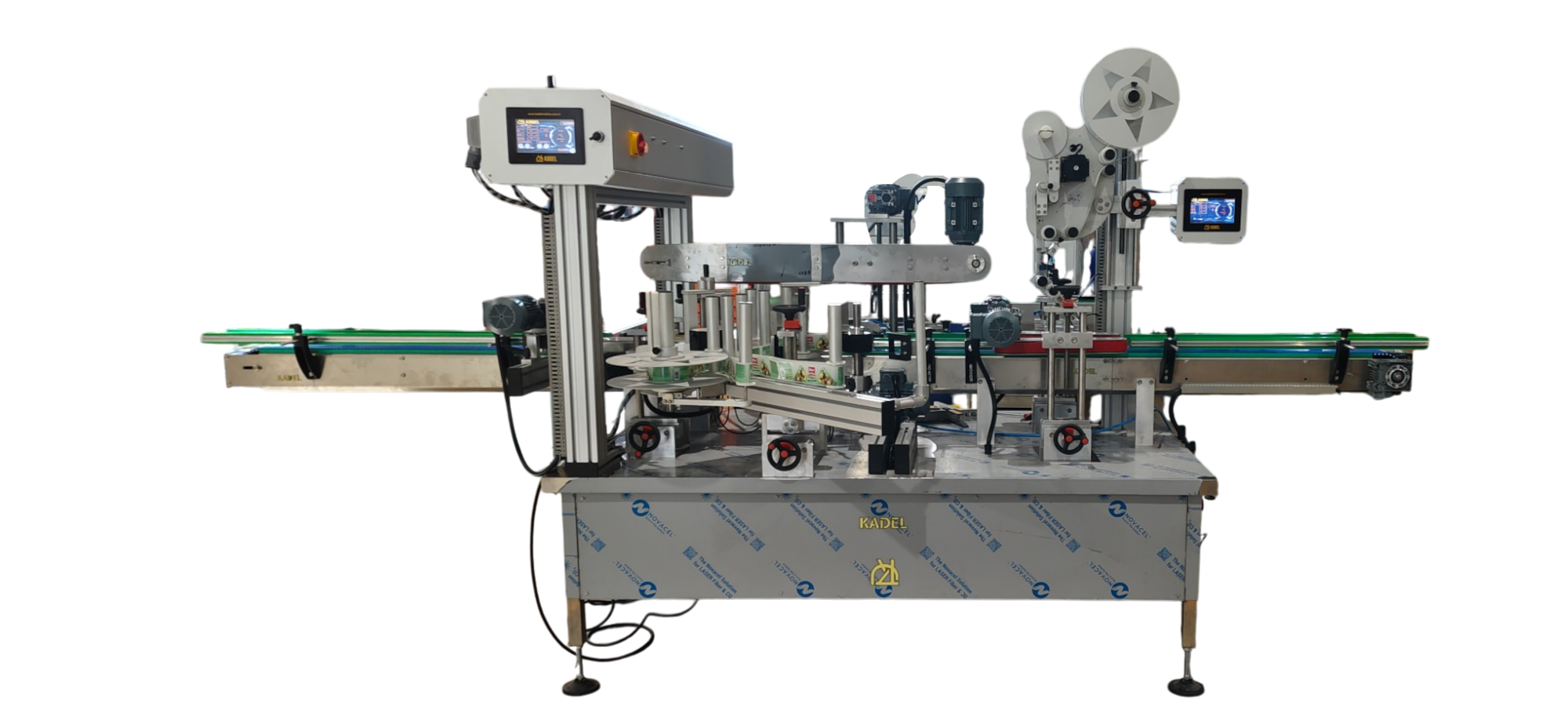 Kadel Makina tarafından geliştirilen bu tam otomatik etiketleme makinesi; silindirik, oval veya düz formlu ürünlerin ön, arka ve üst yüzeylerine aynı anda etiket uygulamas yapabilmek için tasarlanmıştır. Bu sistem, özellikle yüksek hacimli üretim yapan ve çok yönlü ürün etiketlemesi gereken işletmeler için idealdir.